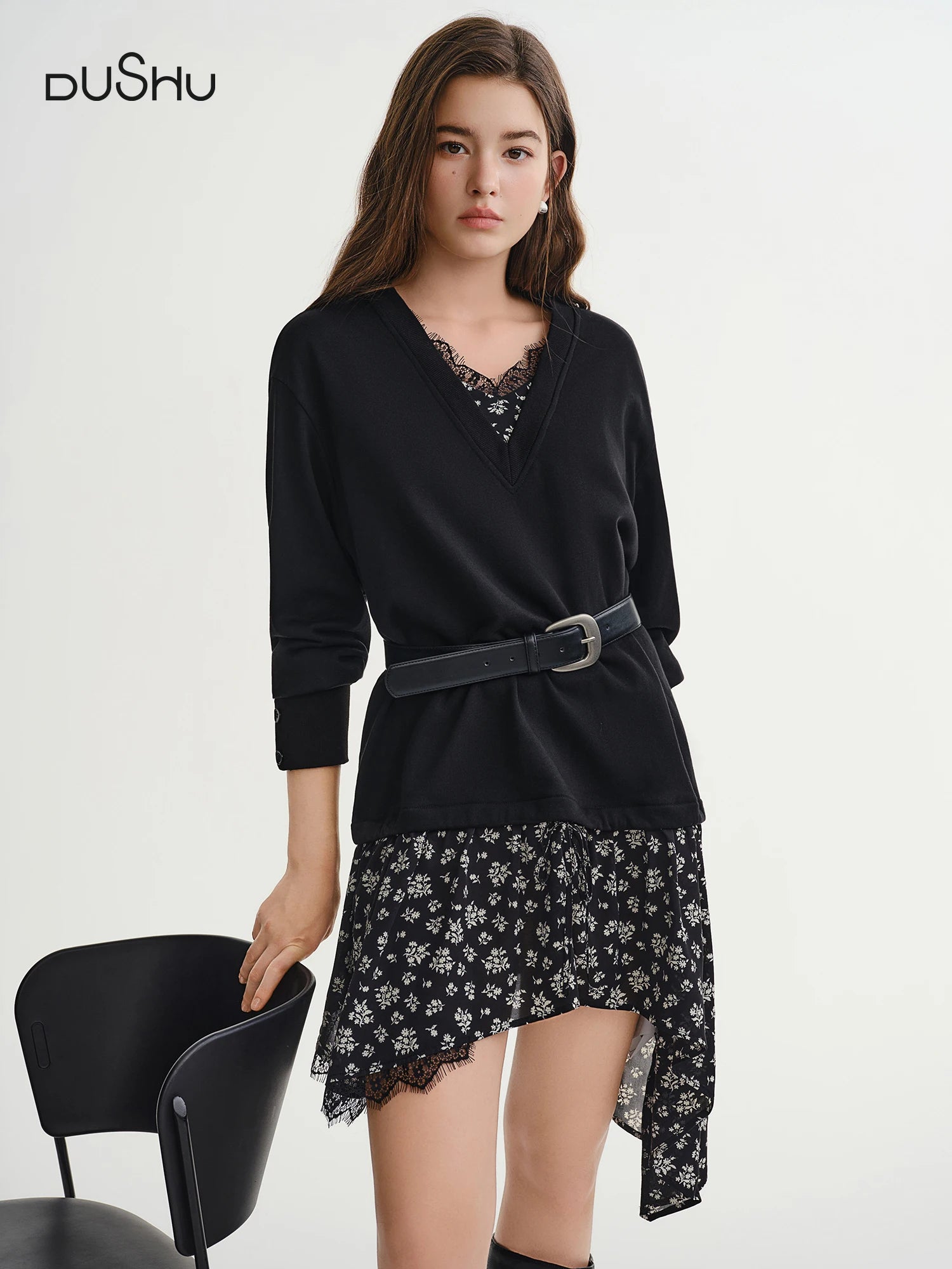 DUSHU Plus Size Women's Sweatshirts Floral Patchwork Fake Two-Piece Hoodie 2025 Winter Korean style Rebel Sweetheart Tops Ins BF