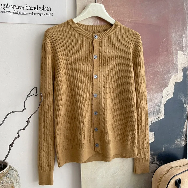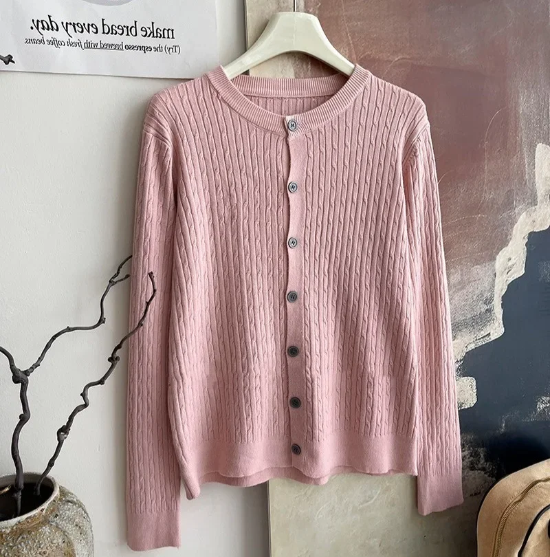 2025 Pure Color Long Sleeve Single Breasted Knitted Sweater Autumn Winter Women's Crew Neck Cardigan New Casual Versatile Tops