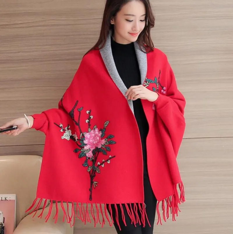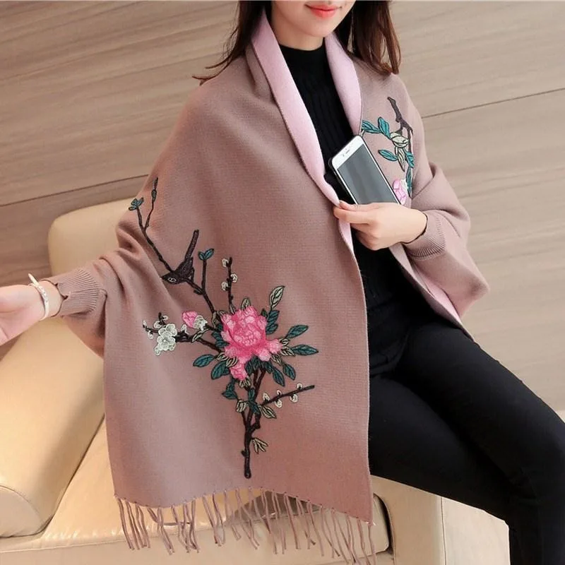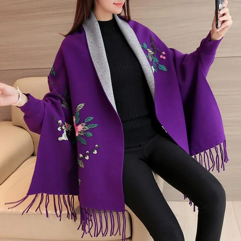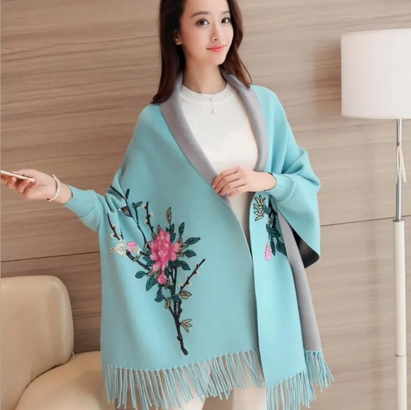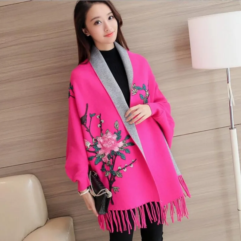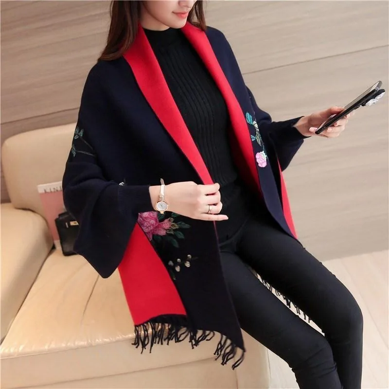 Autumn and winter embroidered cape shawl women's embroidered knitted cardigan tassel knit sweater