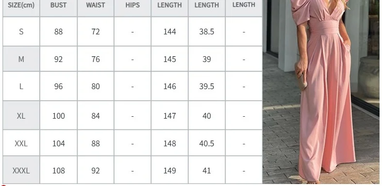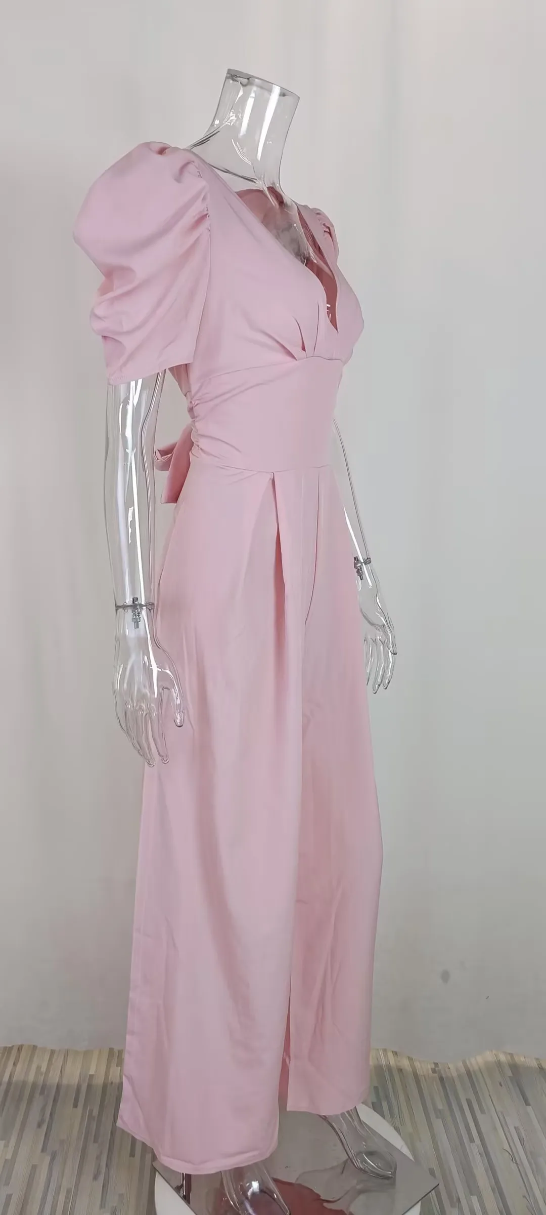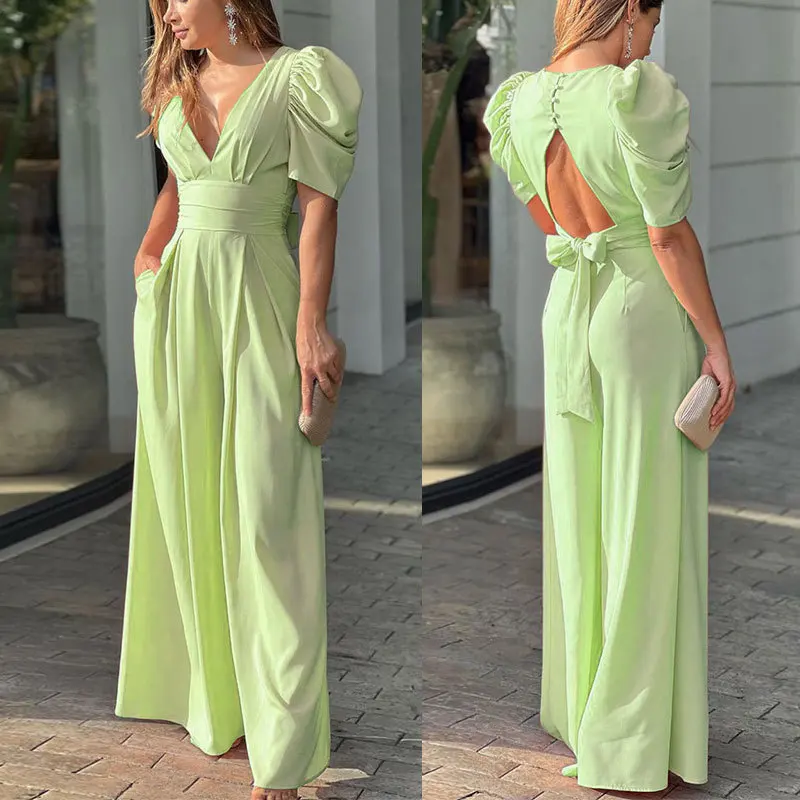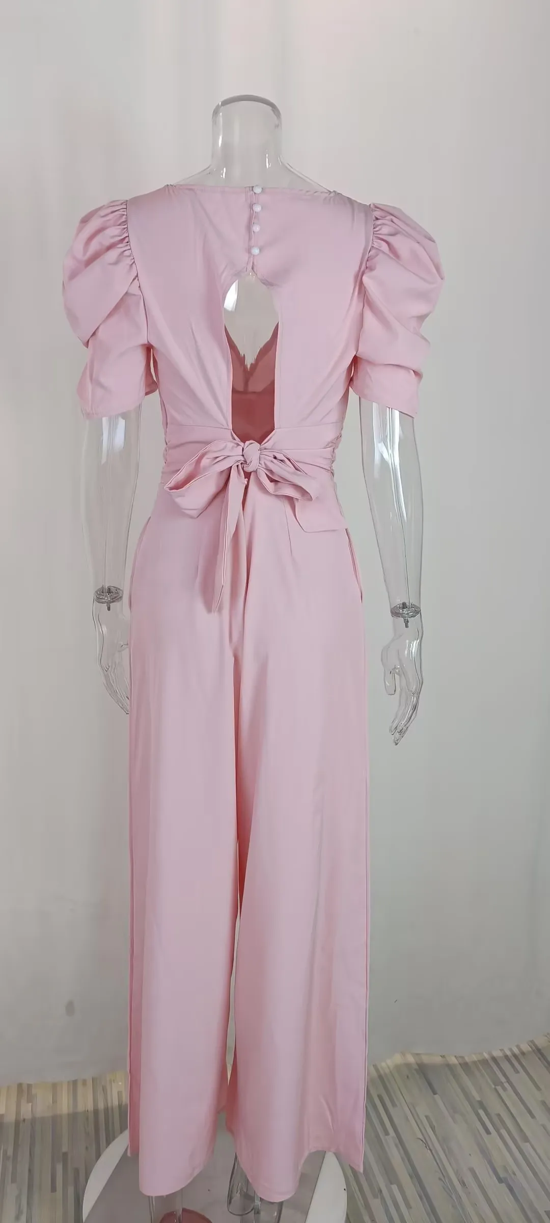Casual Elegant Women's Summer Trendy Deep V-Neck Puff Sleeve Hollow Backless High Waist Jumpsuit Sexy Slim Pearl Button Belt
