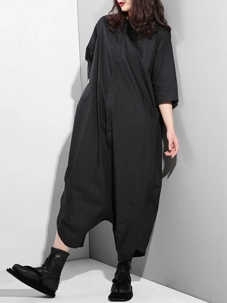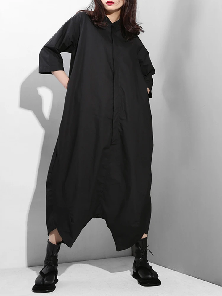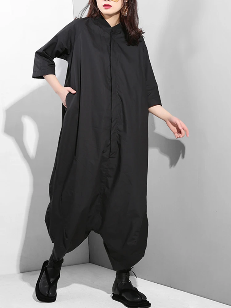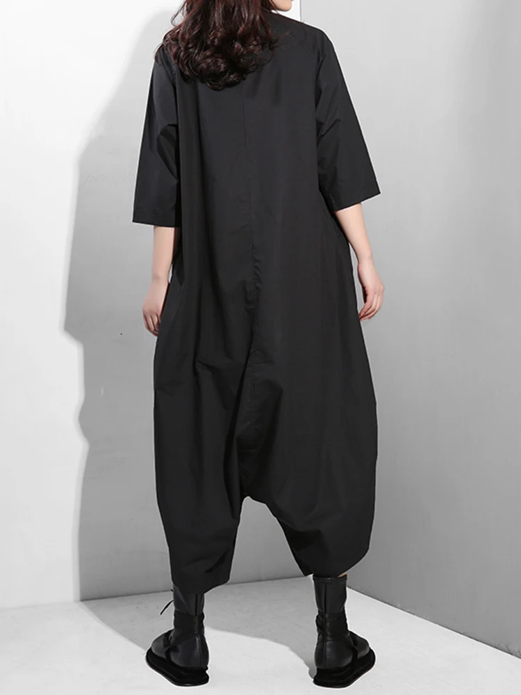[EAM] Loose Fit Women Black Wide Leg Long Jumpsuit New High Waist Pocket Stitch Pants Fashion Tide Spring Autumn 2025 YA11601