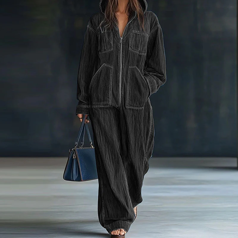 Fashion Zipper Solid Wide Leg Jumpsuits Autumn Hoodies Long Sleeve Pocket Playsuits Overalls Lady Loose Casual Commute Rompers