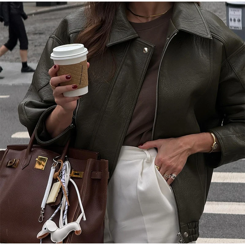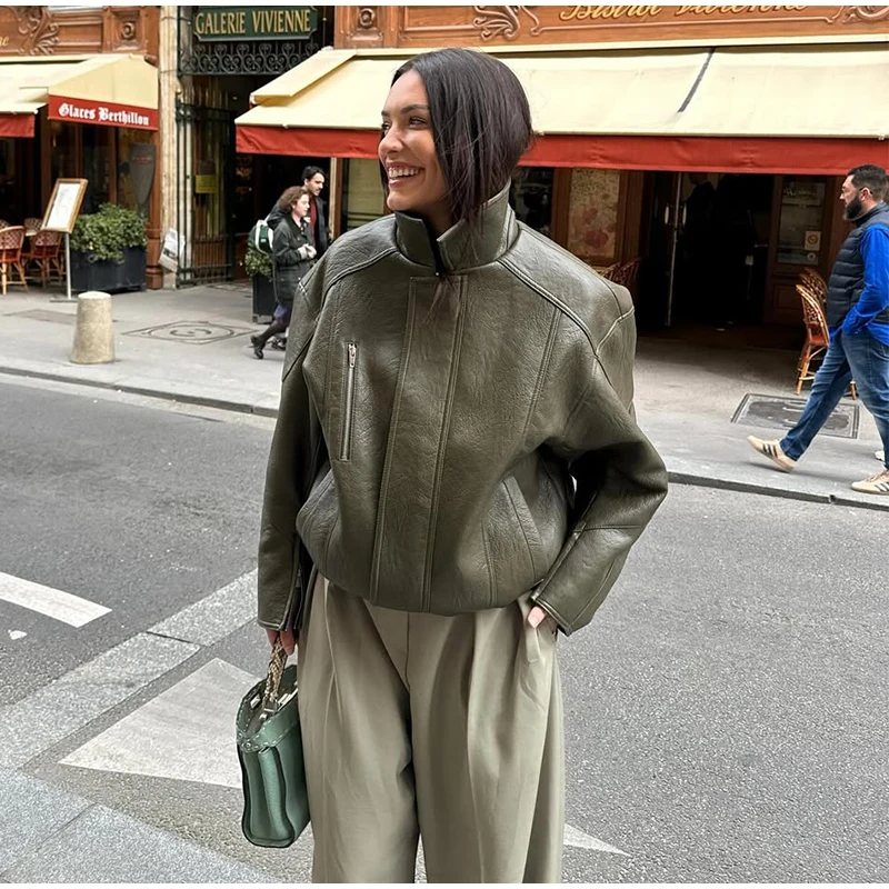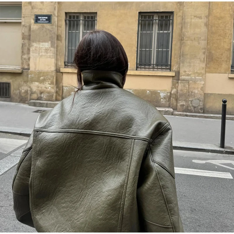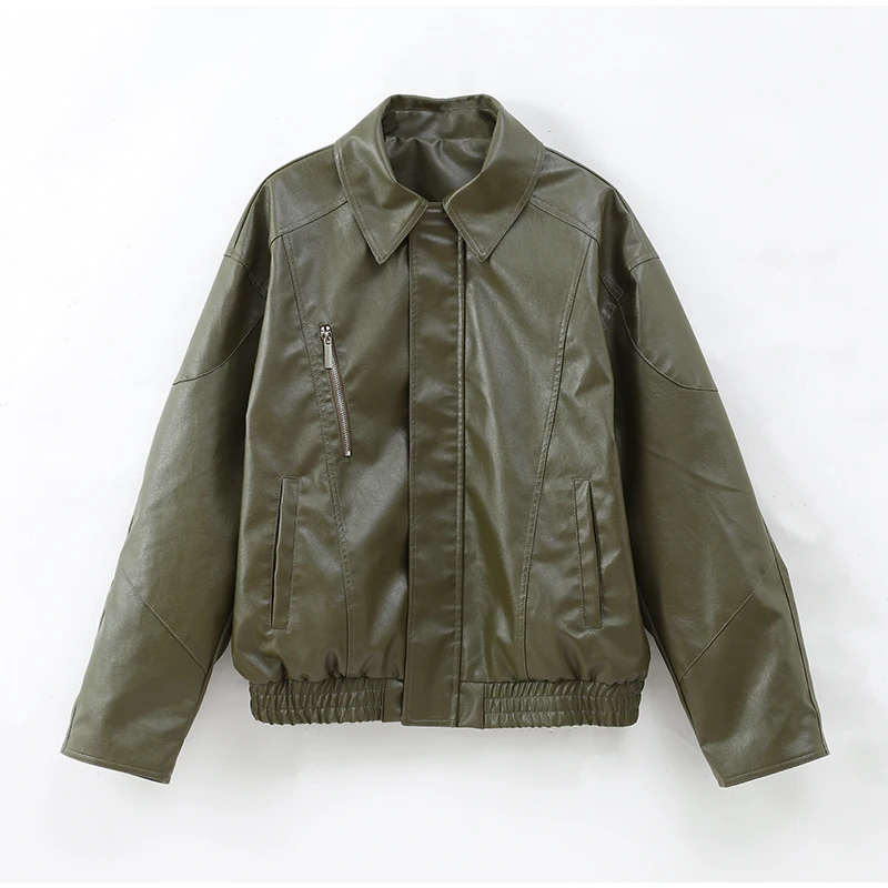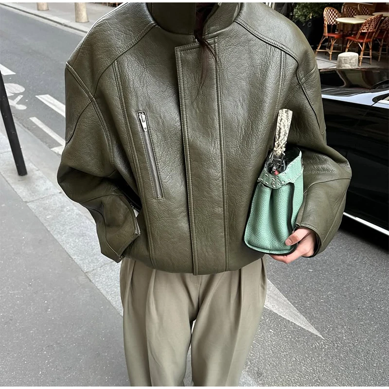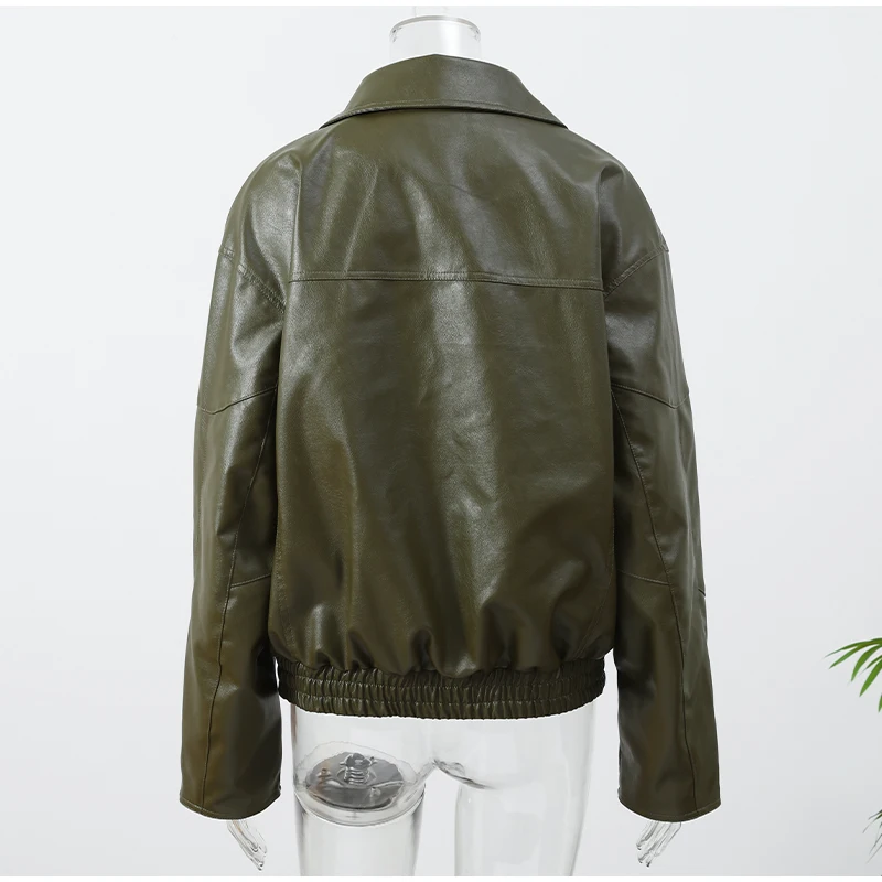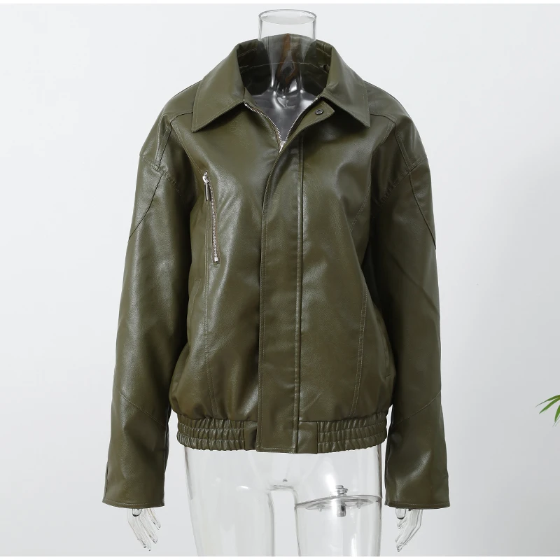 Green Zipper Leather Jacket Women Casual Stand Coller Long Sleeve Loose Coat Chic 2025 Lady Autumn Outerwear Daily Street Coats