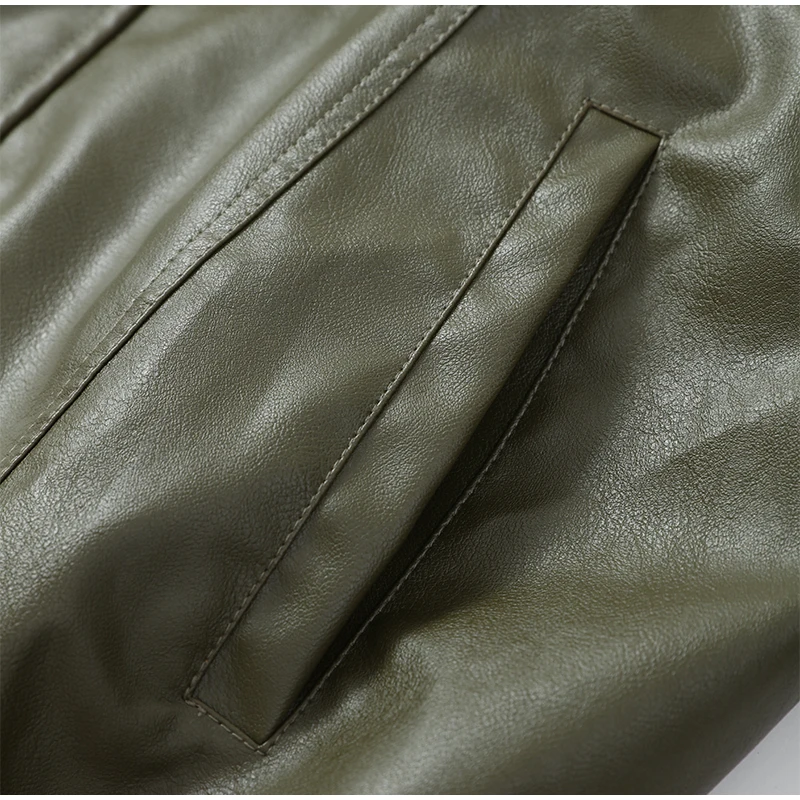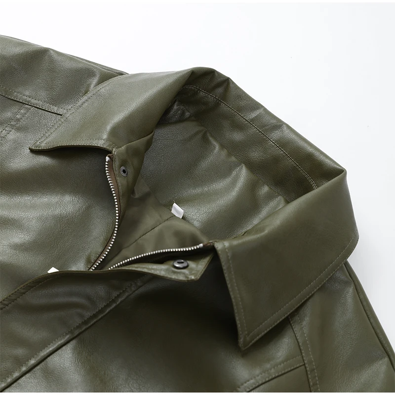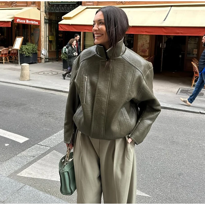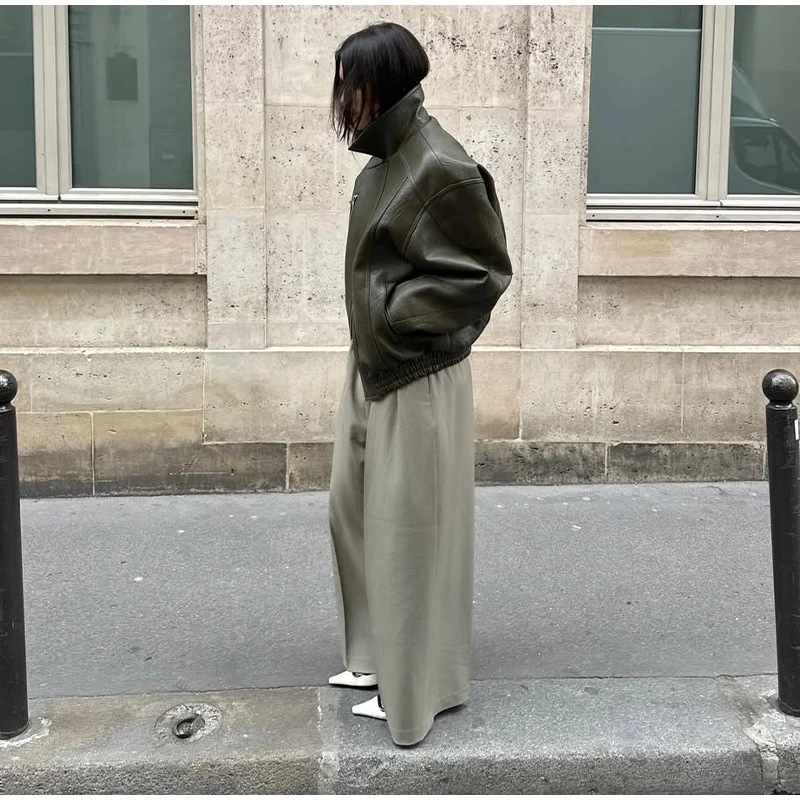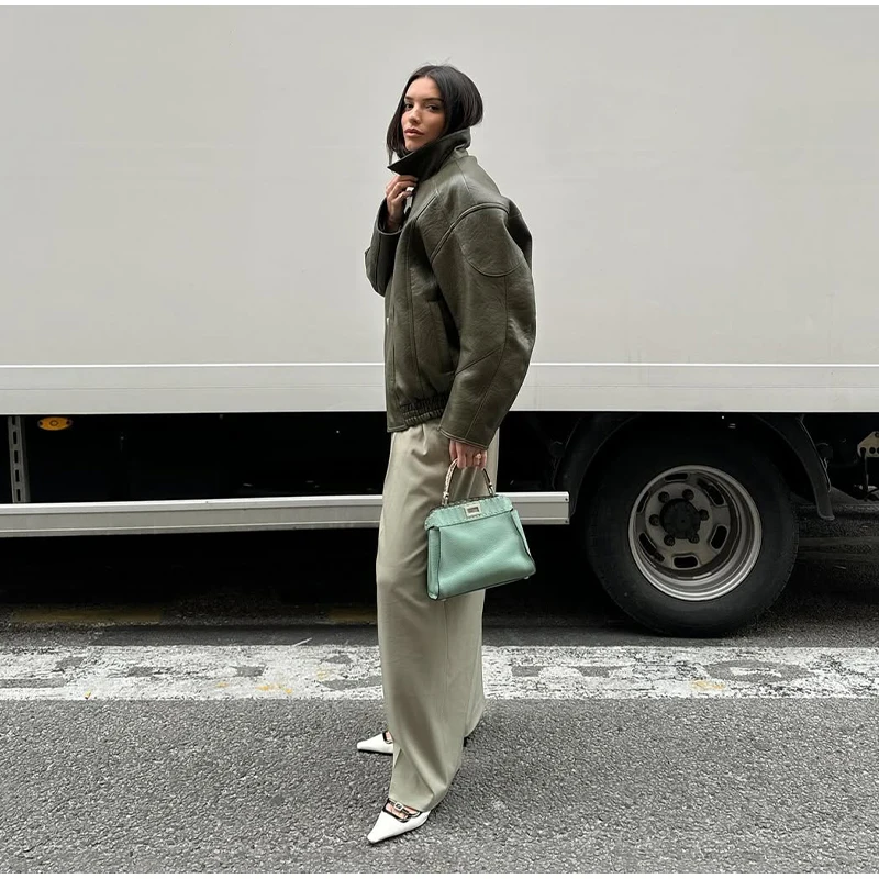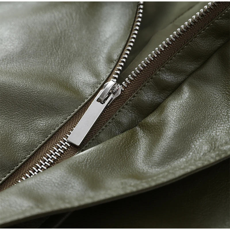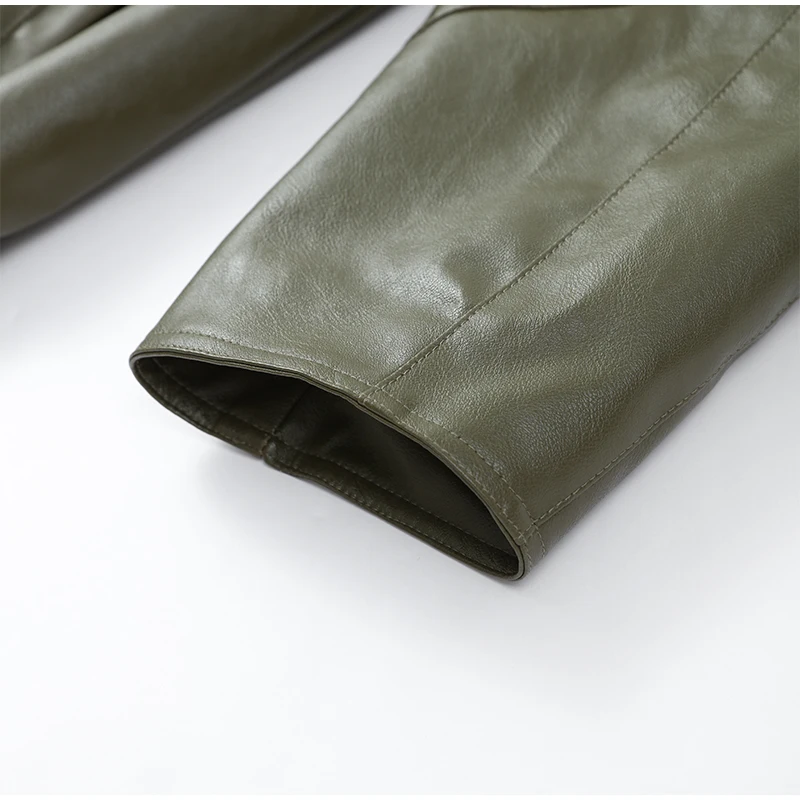 Green Zipper Leather Jacket Women Casual Stand Coller Long Sleeve Loose Coat Chic 2025 Lady Autumn Outerwear Daily Street Coats