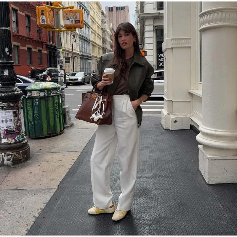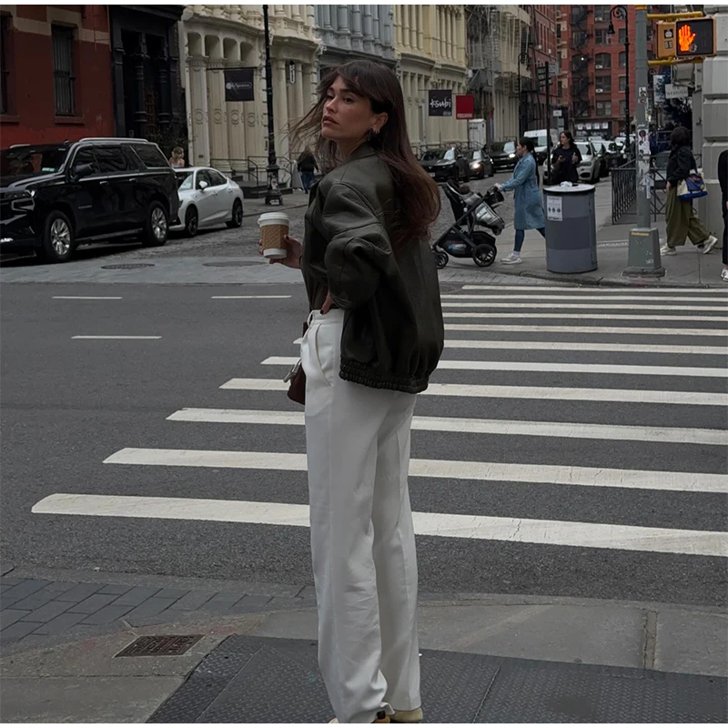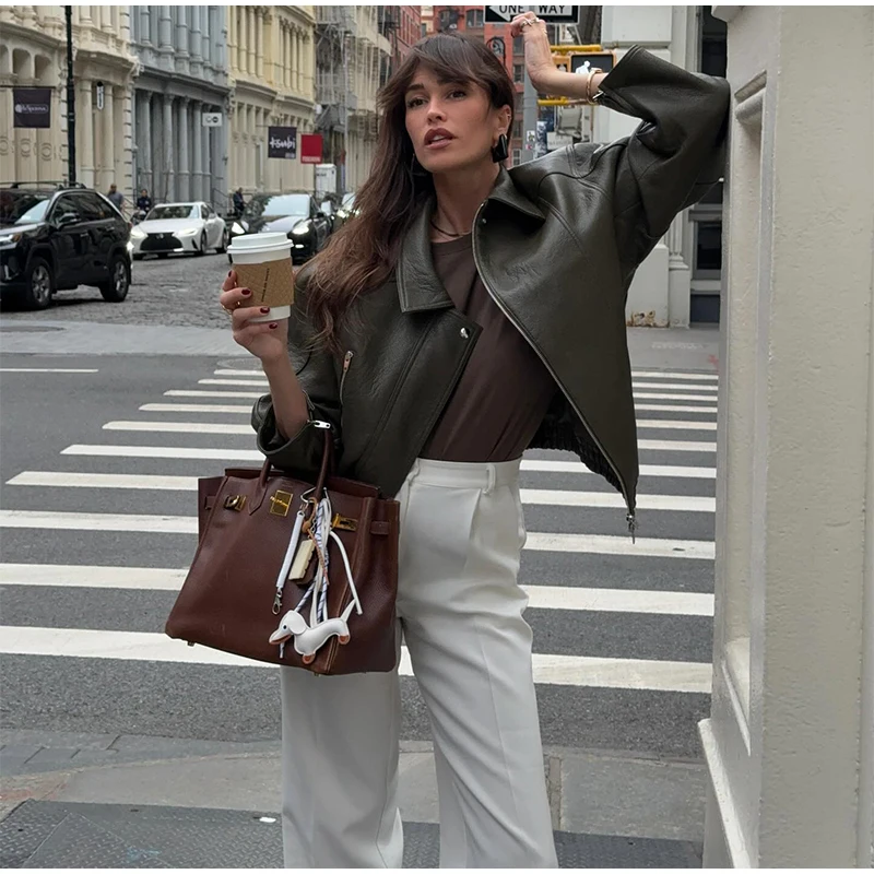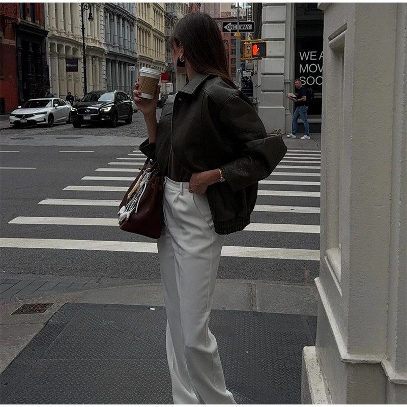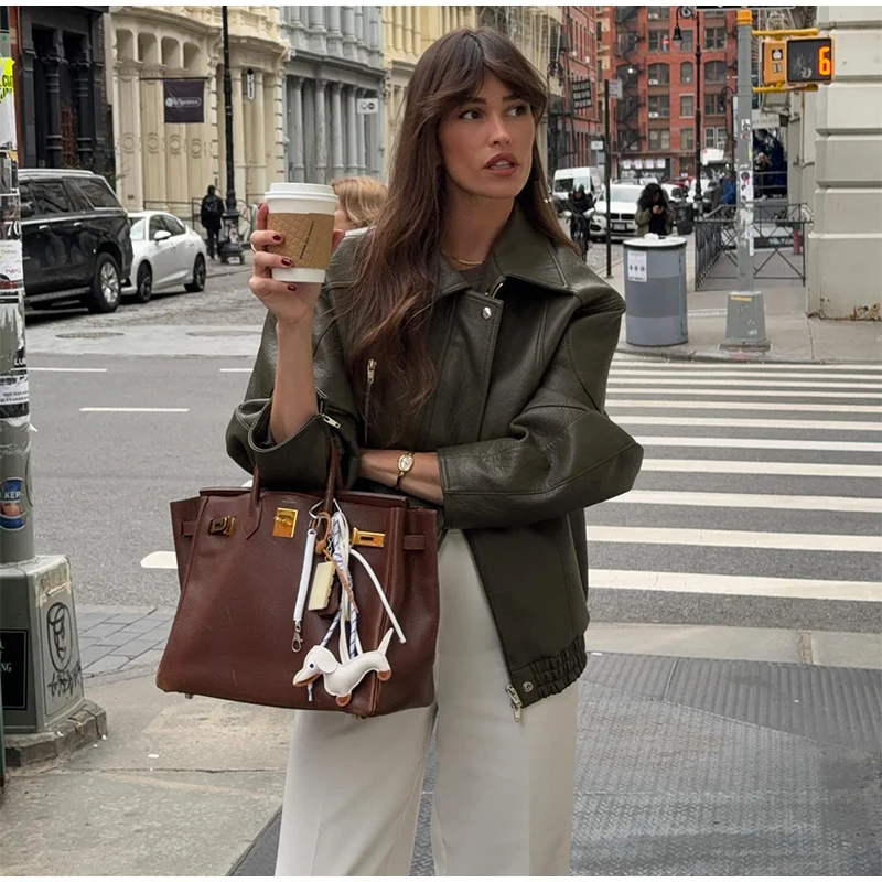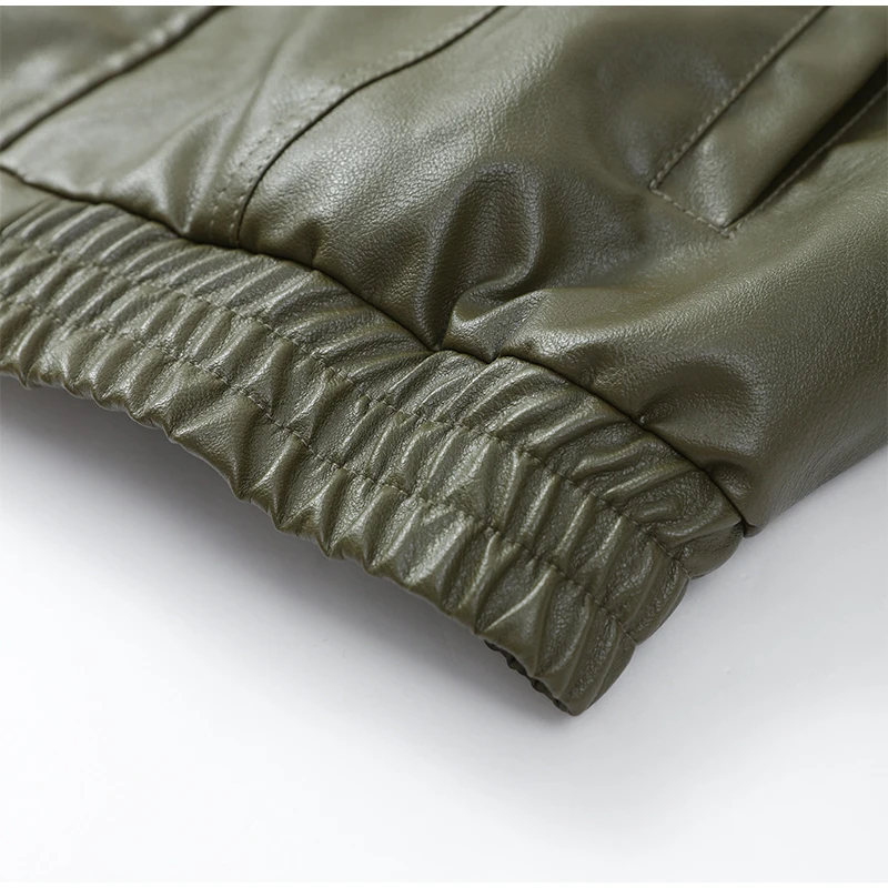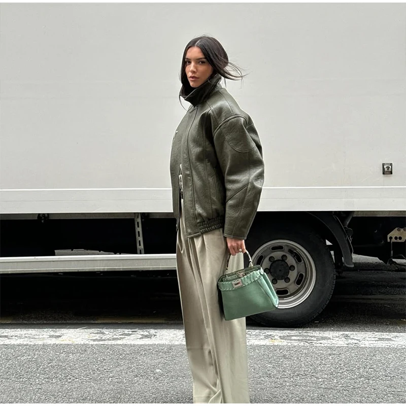Green Zipper Leather Jacket Women Casual Stand Coller Long Sleeve Loose Coat Chic 2025 Lady Autumn Outerwear Daily Street Coats