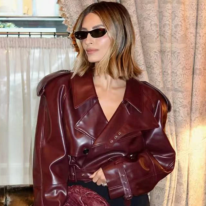 HXAO Cropped Leather Jacket Women's Jacket Autumn 2025 Burgundy Black Outerwears Women's Long Sleeve Top Coat Motorcycle Jacket