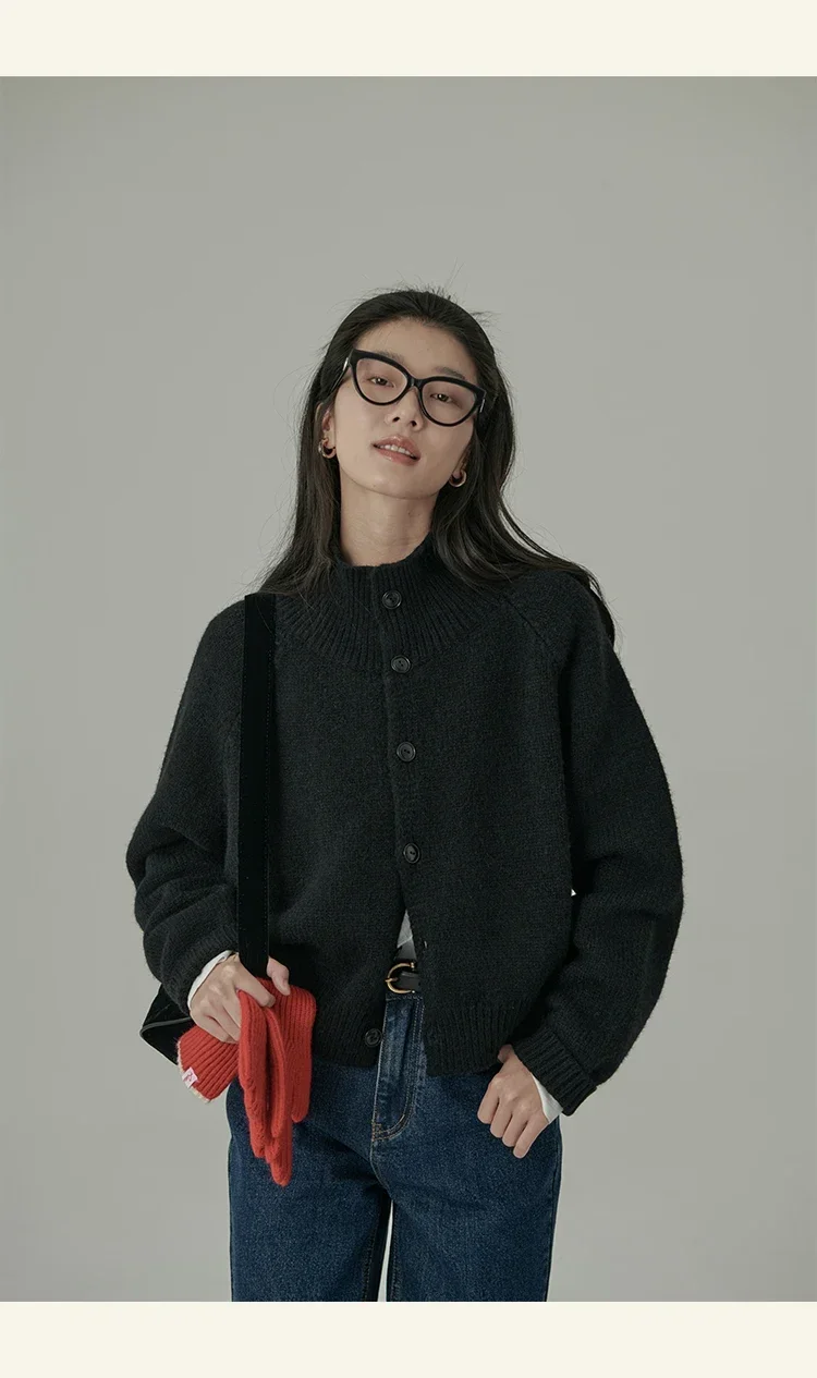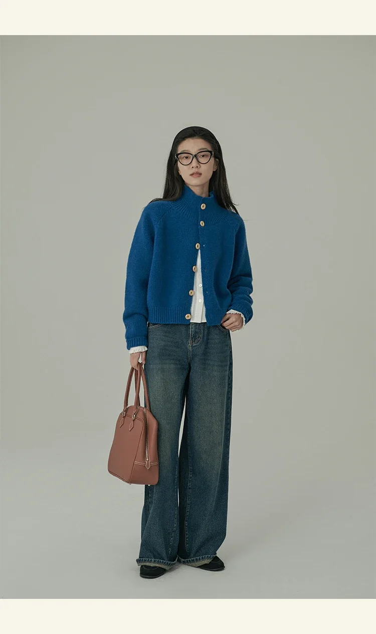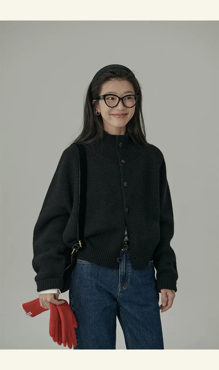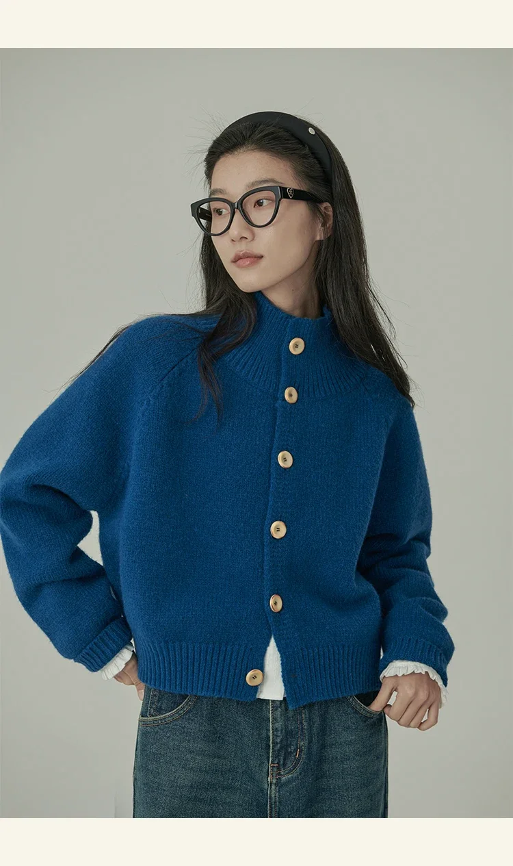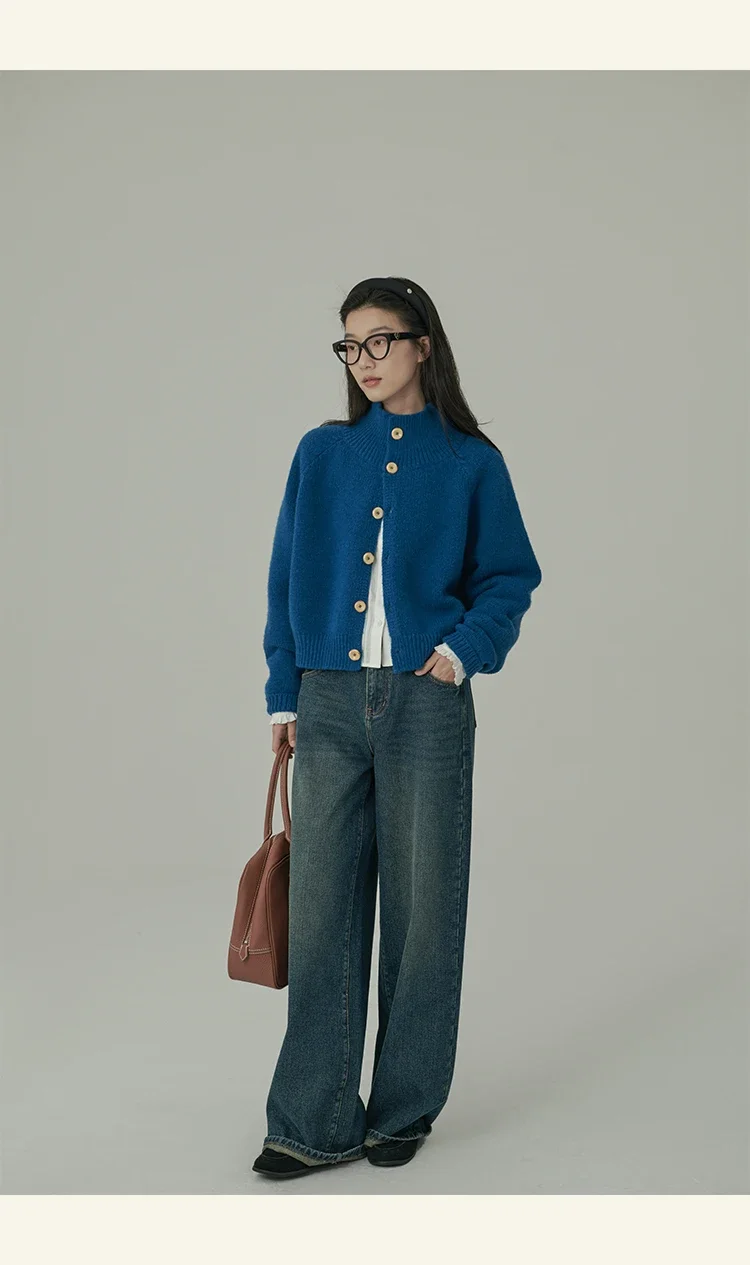Loose Stand-up Collar Cardigan Women Retro Blue Single Breasted Casual Soft Knitwear Sweater Black Fashion Cardigan for Women