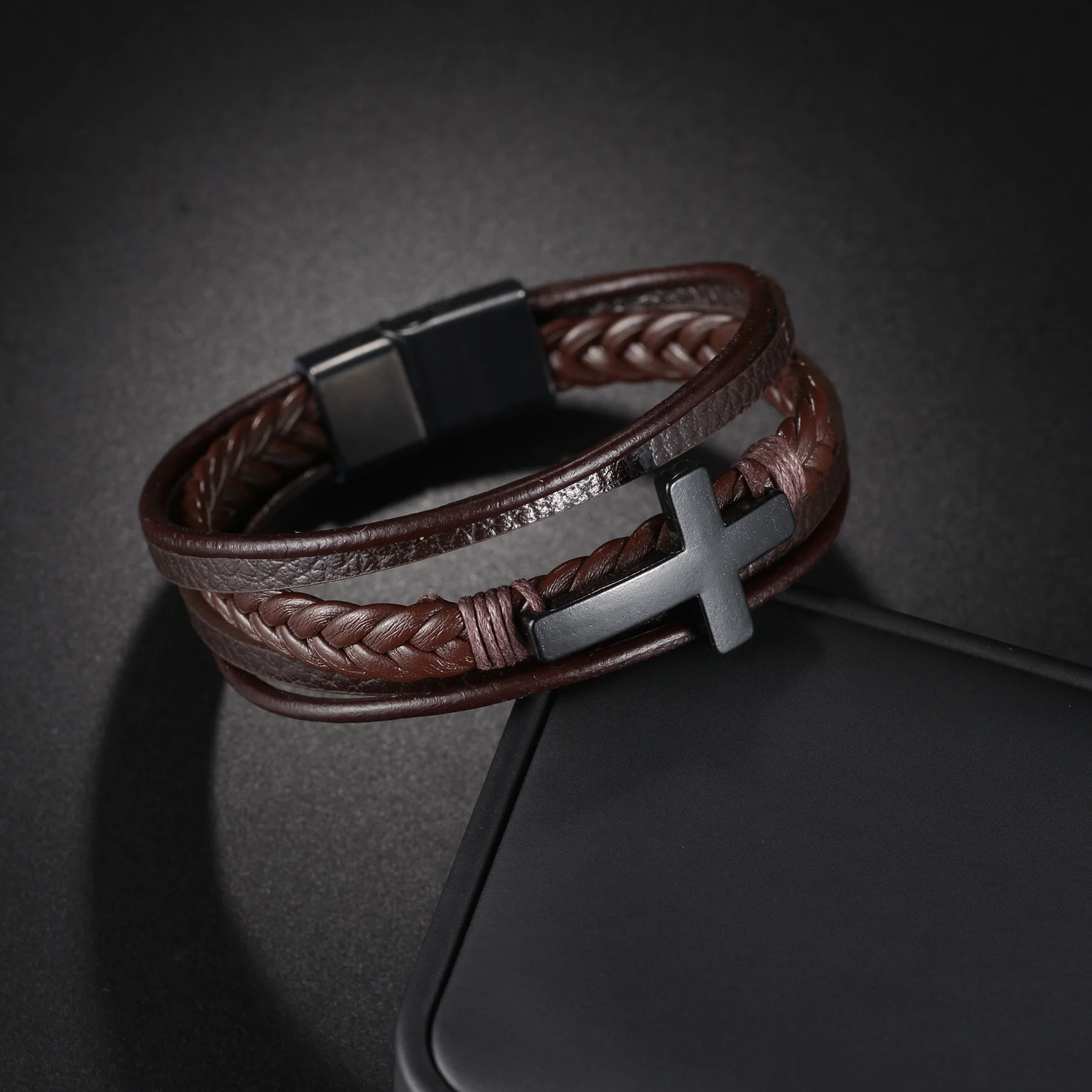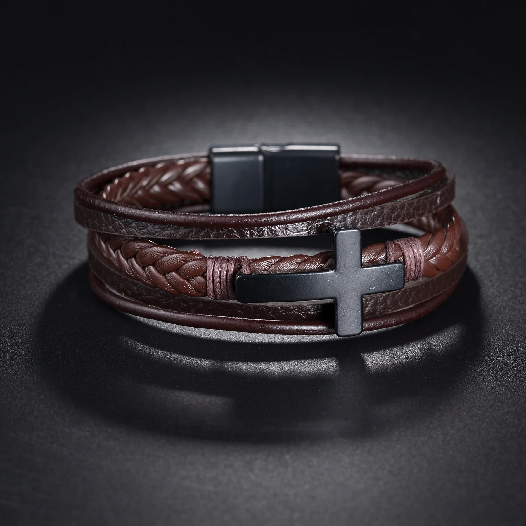 Men's Cross Leather Bracelet Prayer Multi Layer Braided Stainless Steel Fashion Classic Wristband Birthday Gift For Men Women