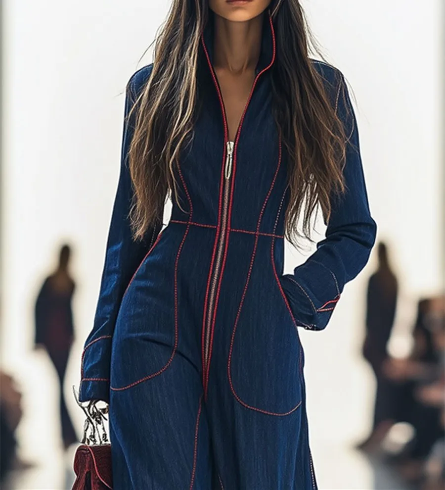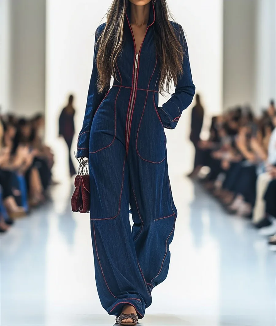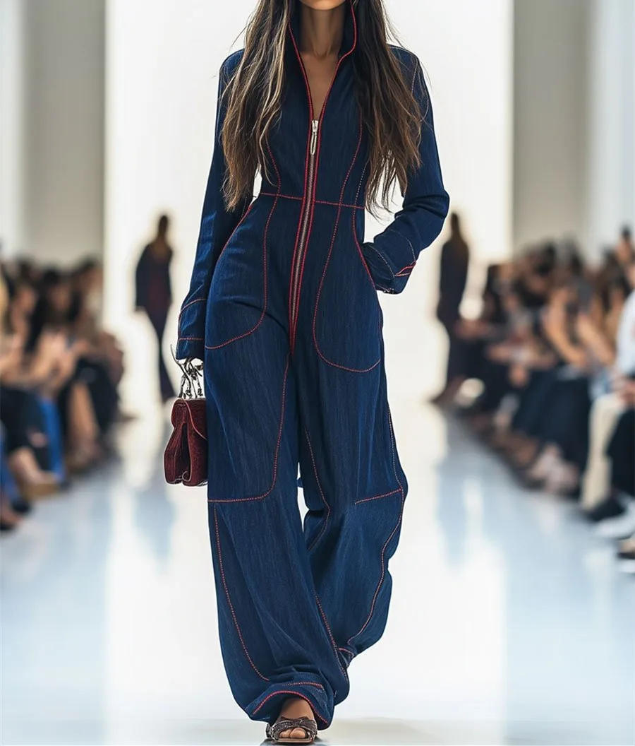 New Fashion Casual Autumn/Winter Long Sleeve V-neck Pockets Solid Color Zipper Wide Leg Jumpsuits
