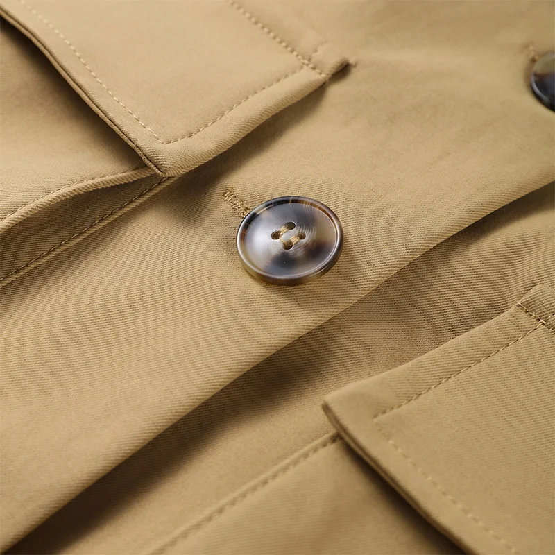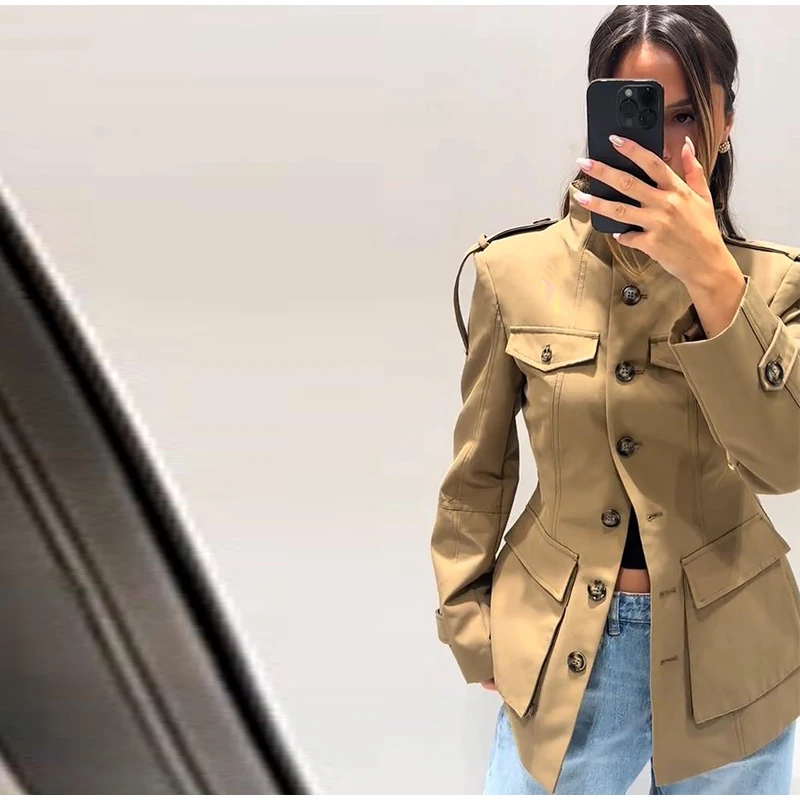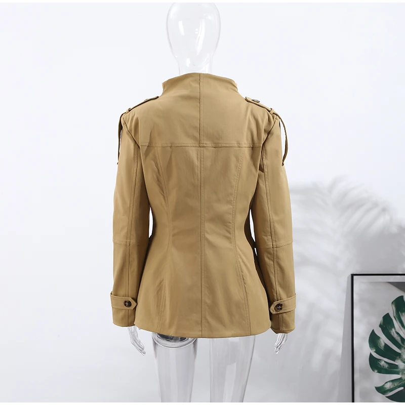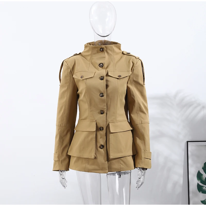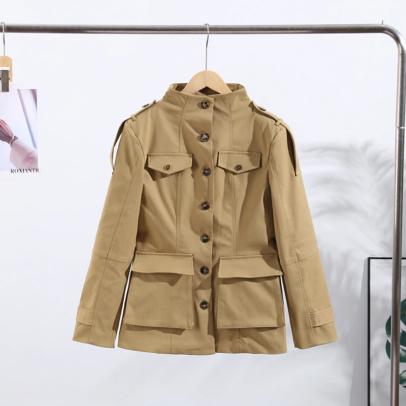 Stand Collar Khaki Cropped Trench Coat Jacket With Pockets Women's Spring Fall Button Front Slim Fit High Street Lady Outerwear