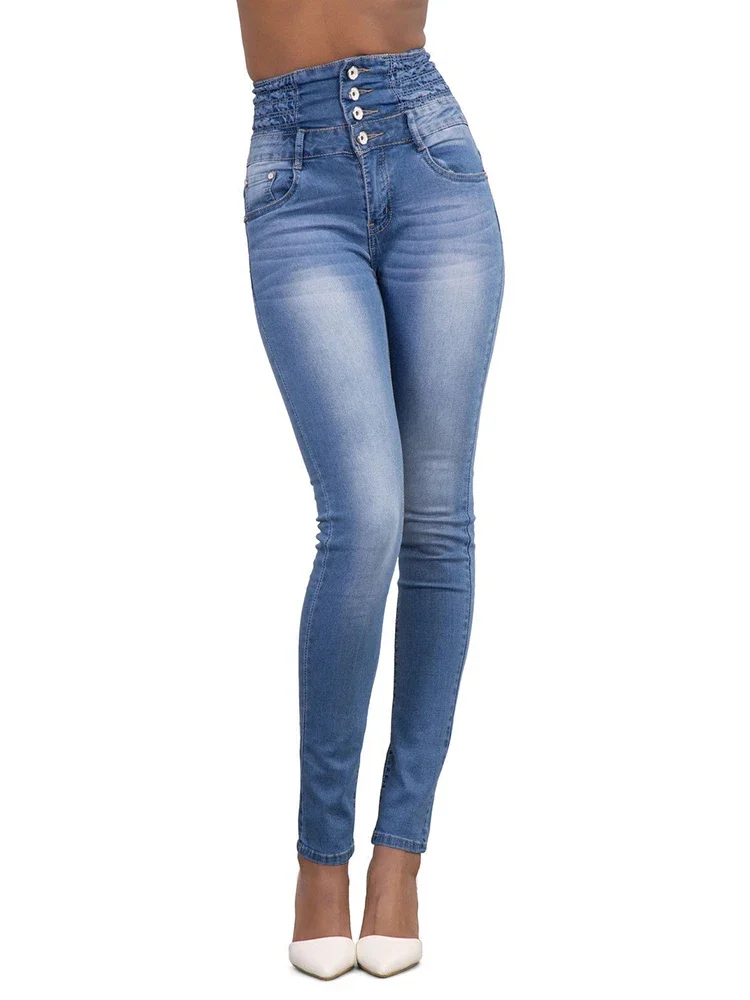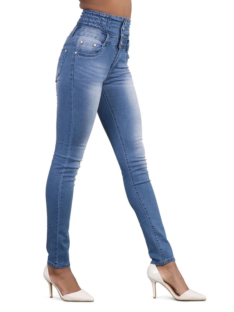 Women Narrow Straight Leg Slim Wrap Hips Jeans Lady Vintage Pencil Long Pants Casual Button Stretch High Waist Skinny Trousers