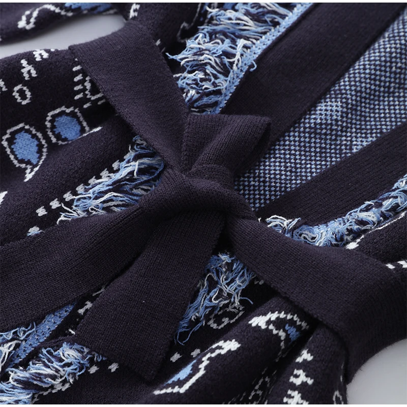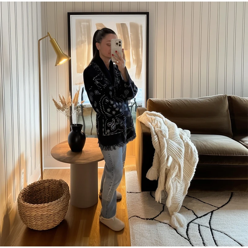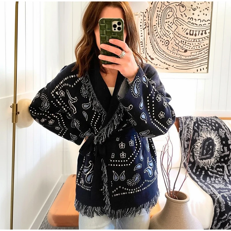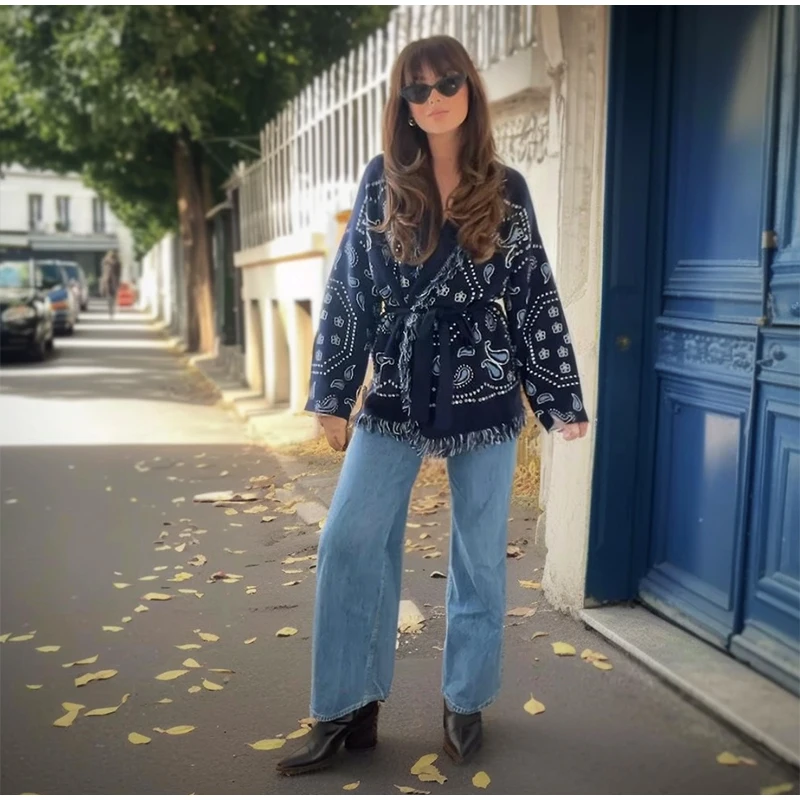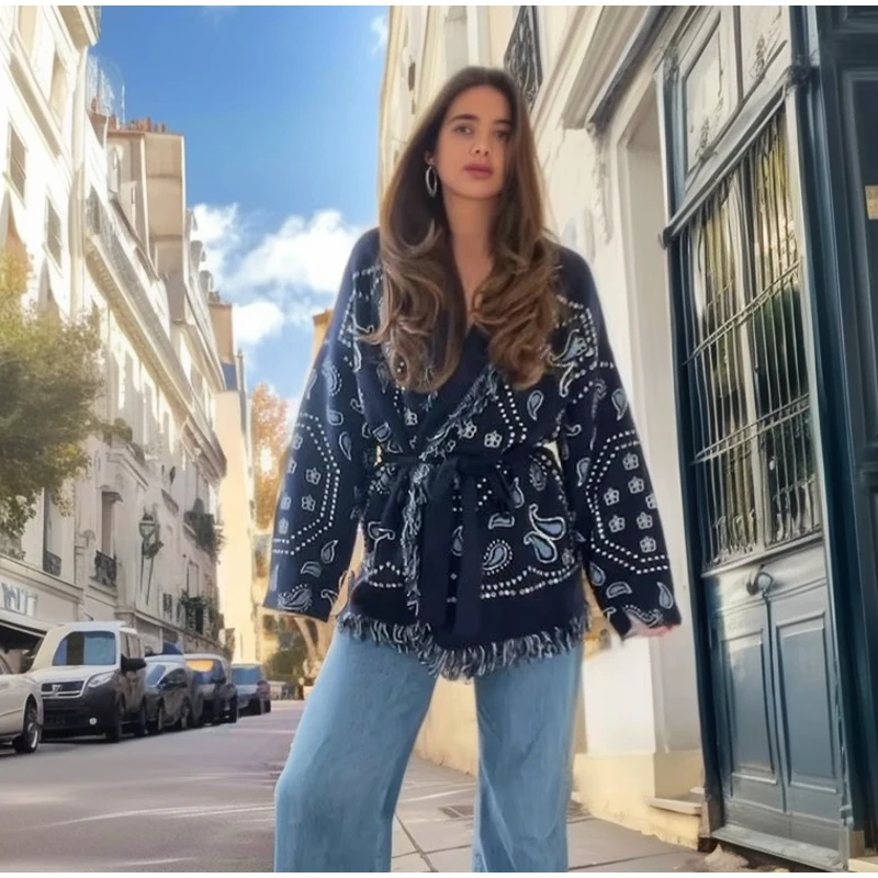 Women Print Knitted Cardigan Casual Chic V-neck Long Sleeve  Single-breasted Return Loose Sweater 2025 Lady Autumn Street Coats