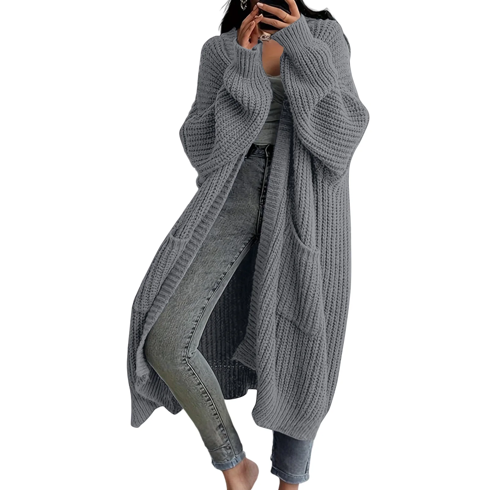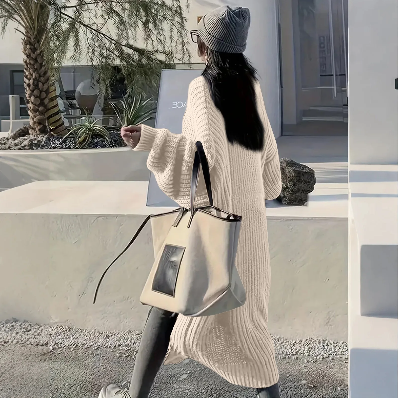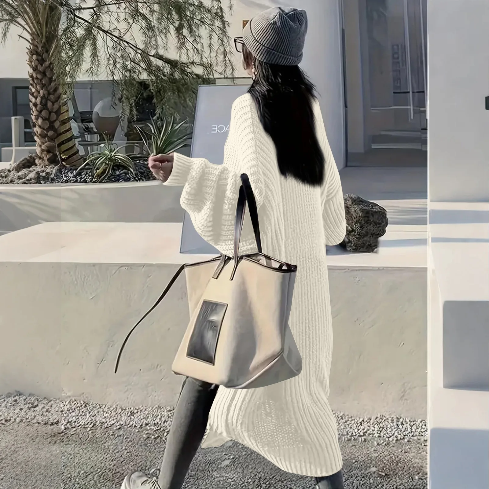 Women's Solid Color Long Sleeved Knee Length Knitted Cardigan, Lazy Trend, Medium Long Hair Jacket