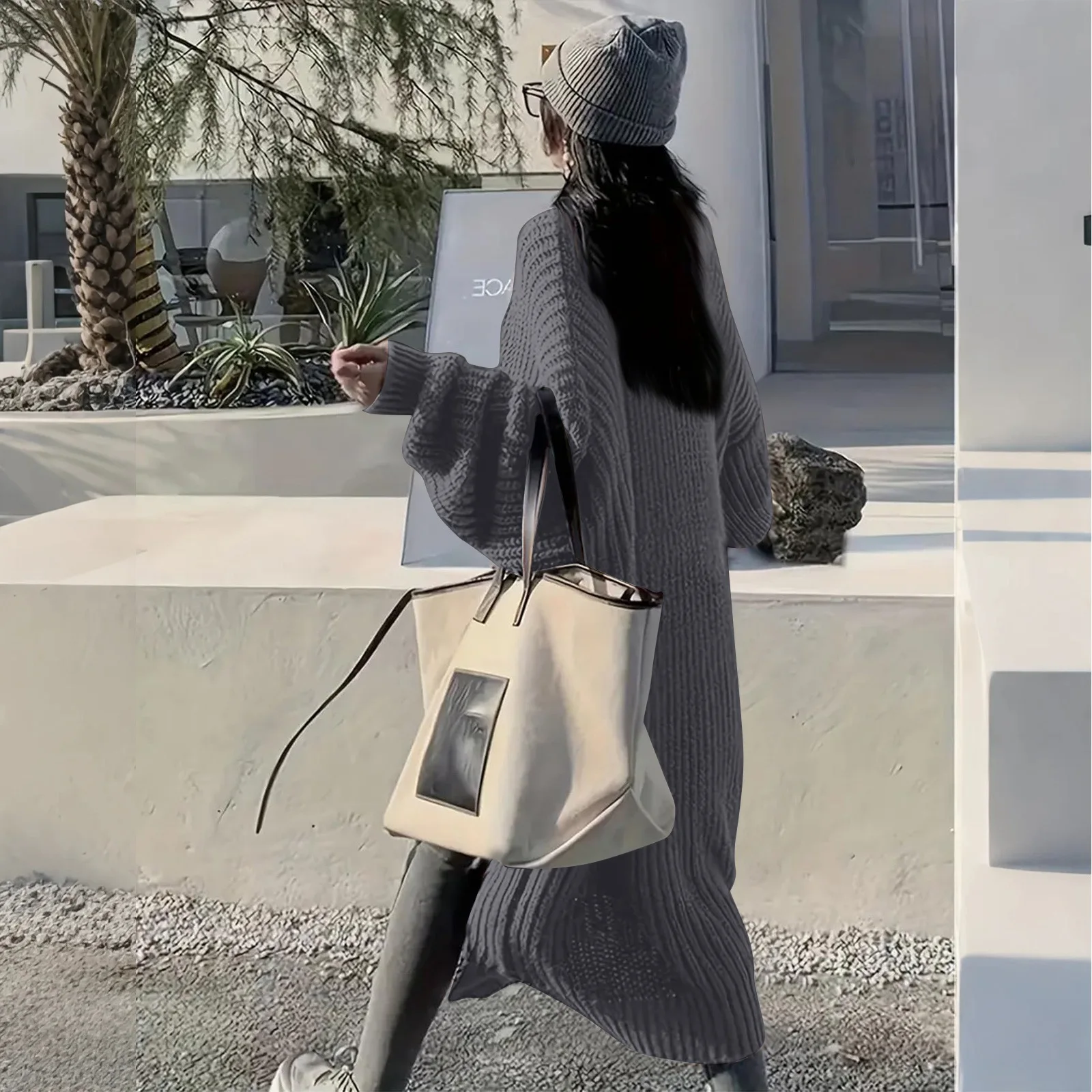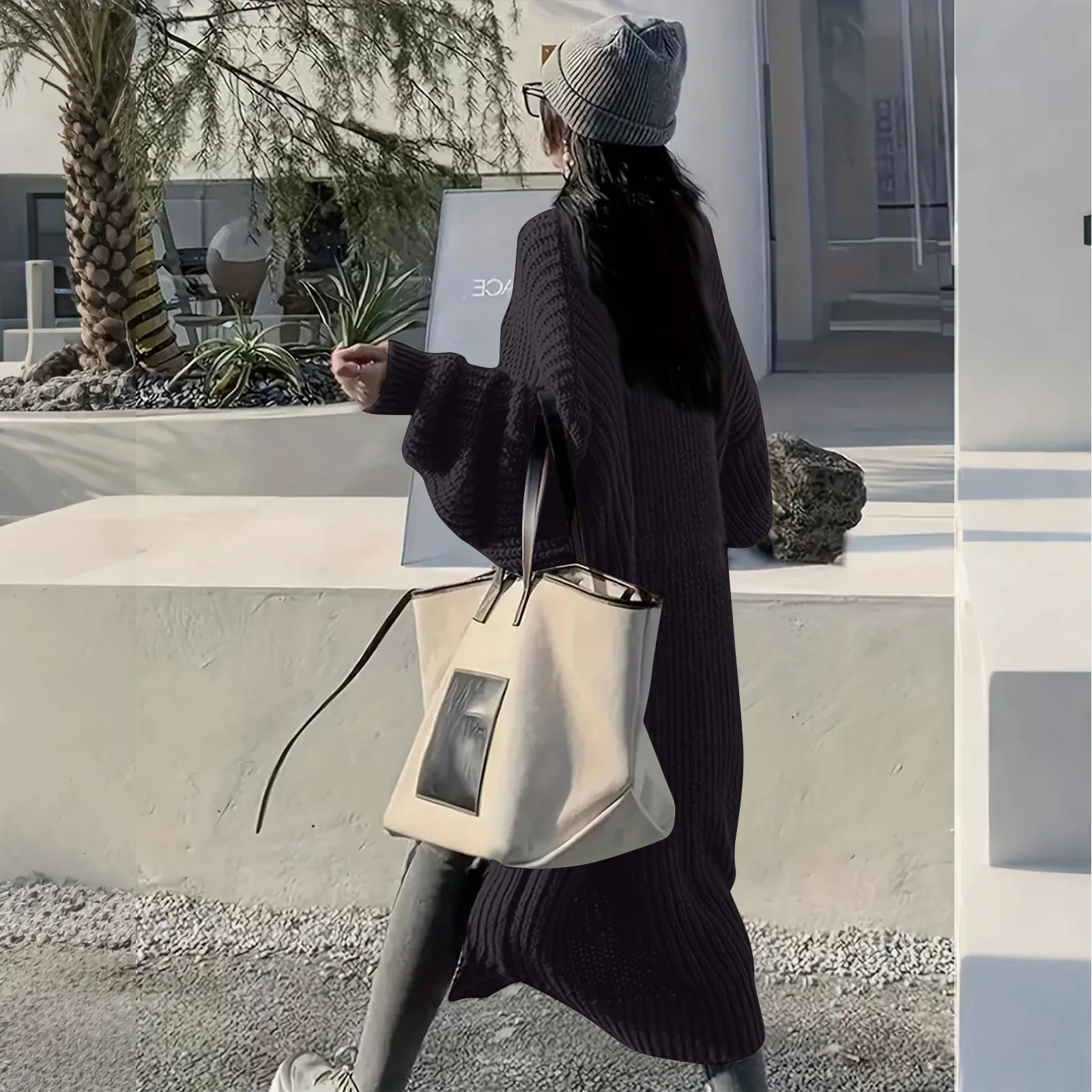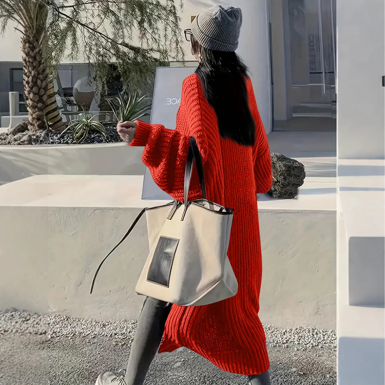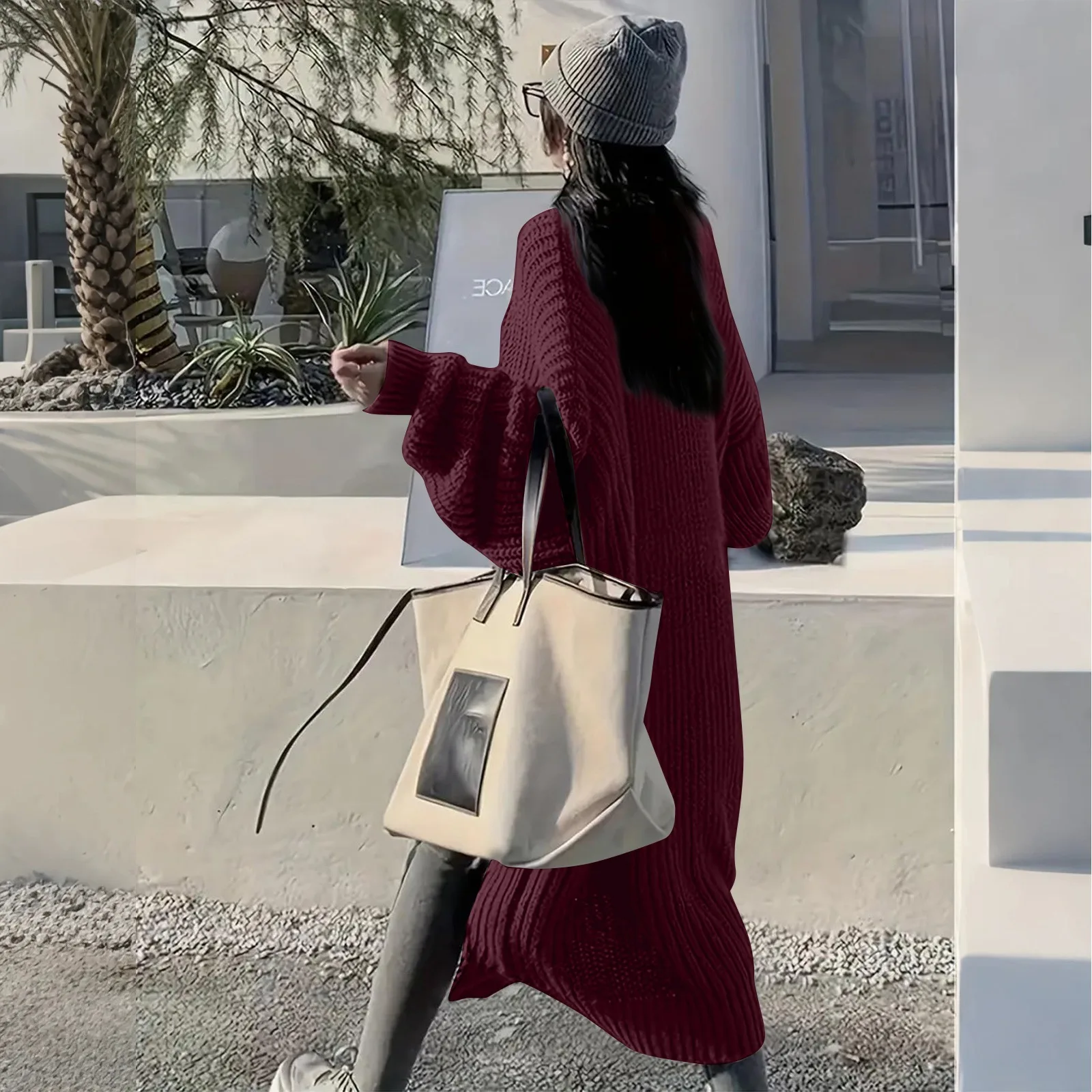 Women's Solid Color Long Sleeved Knee Length Knitted Cardigan, Lazy Trend, Medium Long Hair Jacket