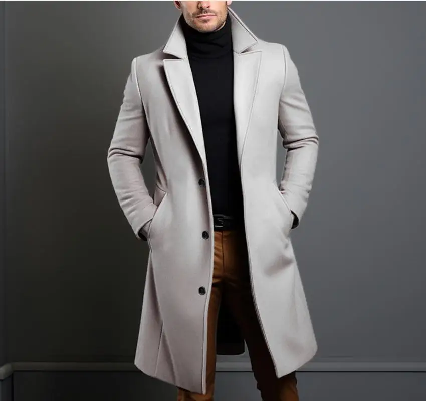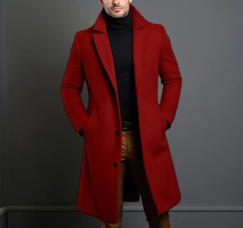Woolen Coat Men's Long Solid Color Autumn Winter Woolen Coat Warm Youth Coat Trench Cardigan
