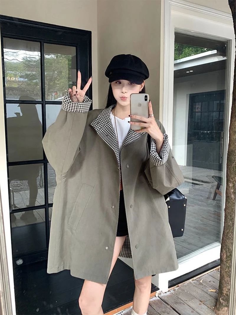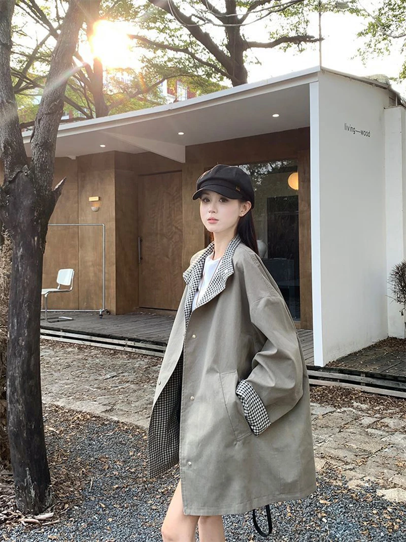 Zoki Korean Chic Elegant Jacket Women Loose Design Double Sided Wear Plaid Coat Fall Fashion Long Sleeve Sweet Pockets Outwear